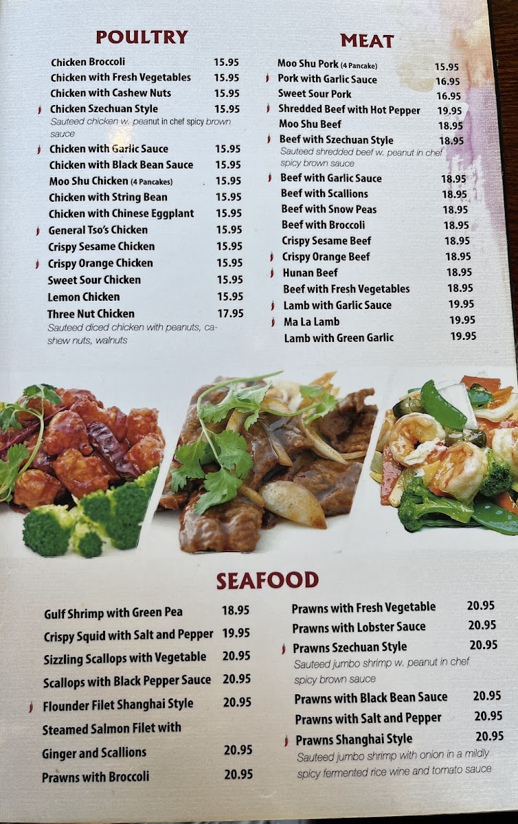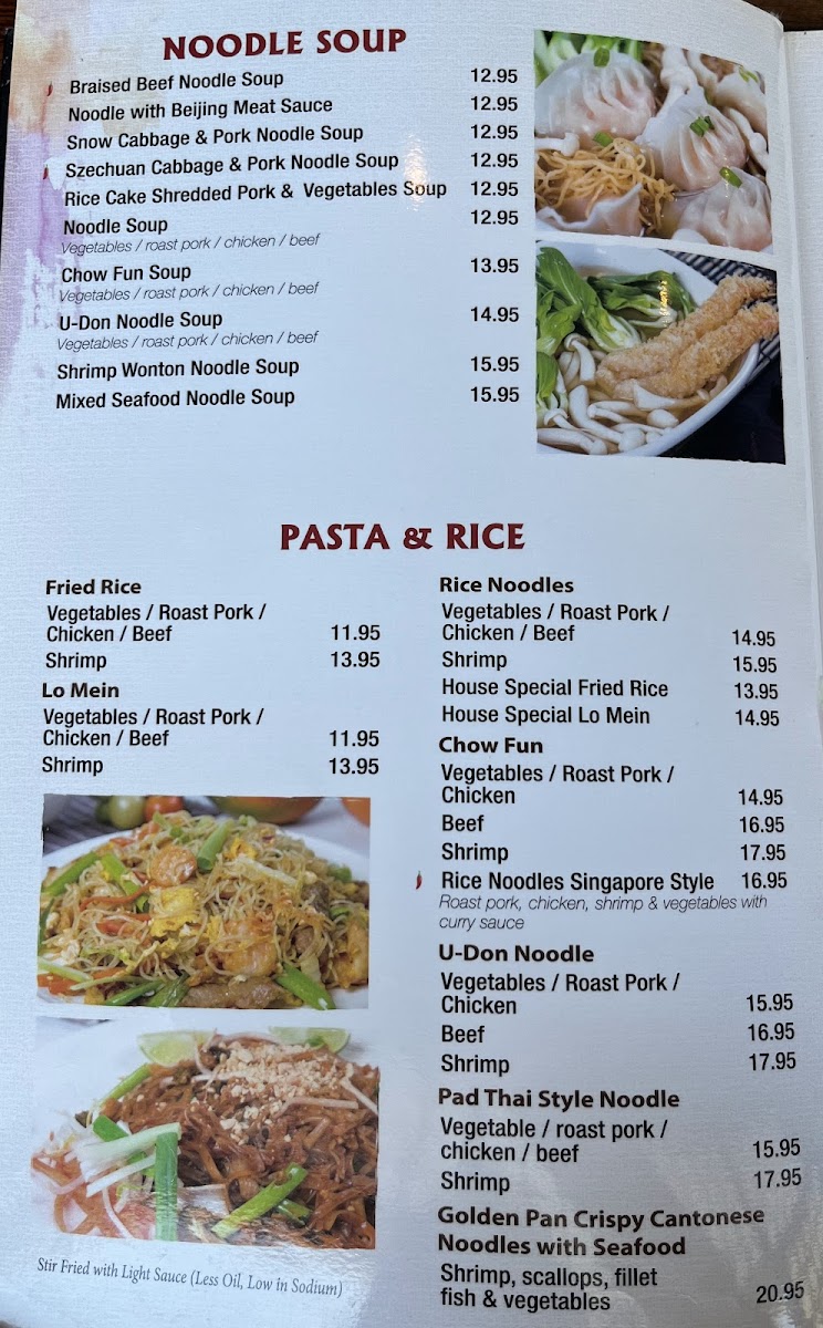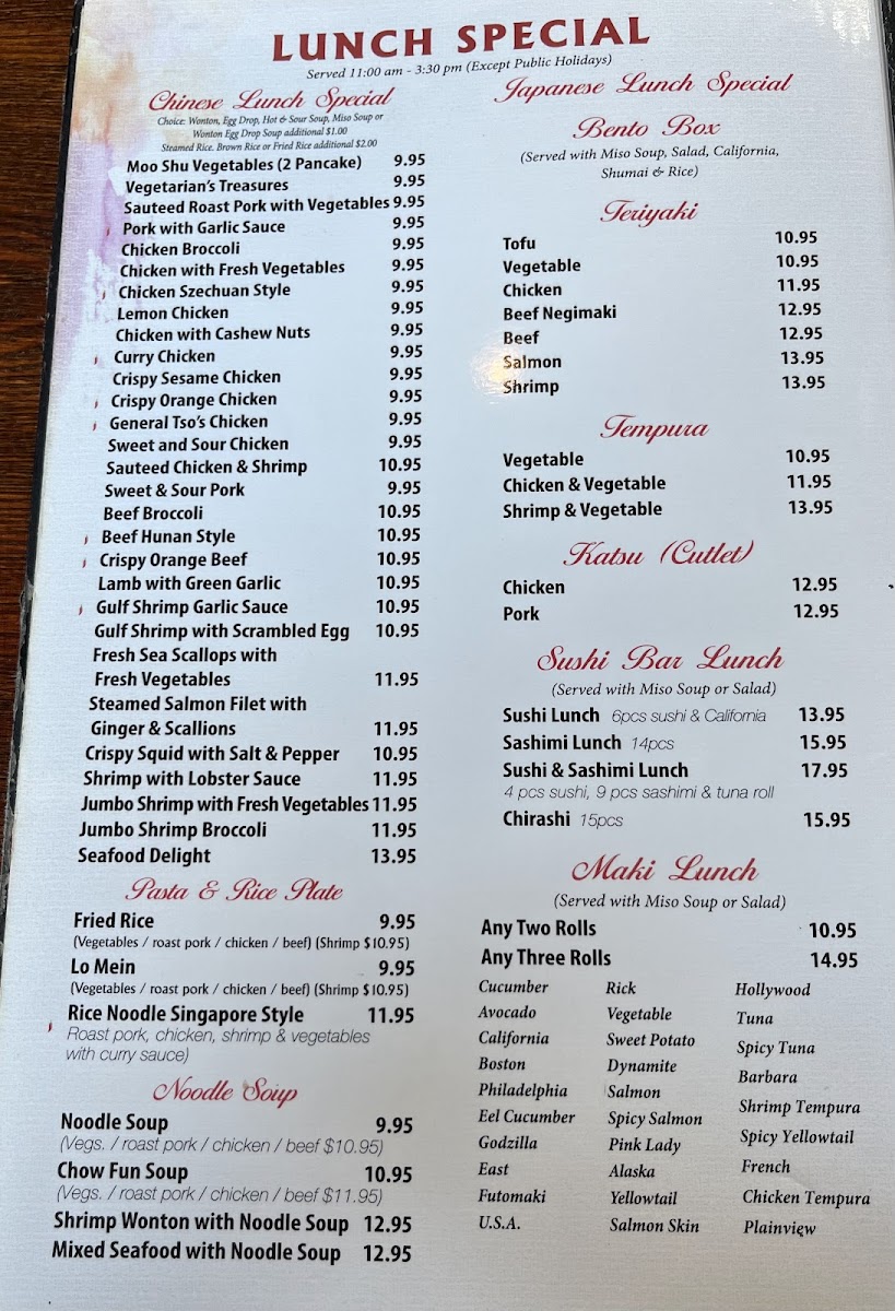 Food is delicious! Vegetables always crisp not soggy. Their black bean sauce is exceptionally good. It’s a comfortable place to dine in and offers both a Chinese and Japanese menu. We have eaten I several times and get delivery pretty often. Delivery has its drawbacks as there are no family specials permitted nor sizes of most dishes.