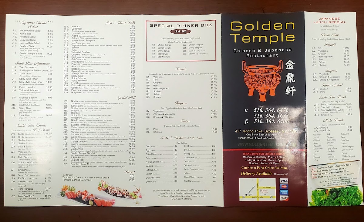Welcome to Golden Temple, a delightful oasis of flavors nestled at 417 Jericho Tpke, Syosset, NY 11791. This charming restaurant, boasting both a Chinese and Japanese menu, has won the hearts of many for its commitment to authenticity and quality. Renowned for its clean ambiance and friendly, professional staff, Golden Temple offers a dining experience that's as warm and inviting as its meticulously crafted dishes.